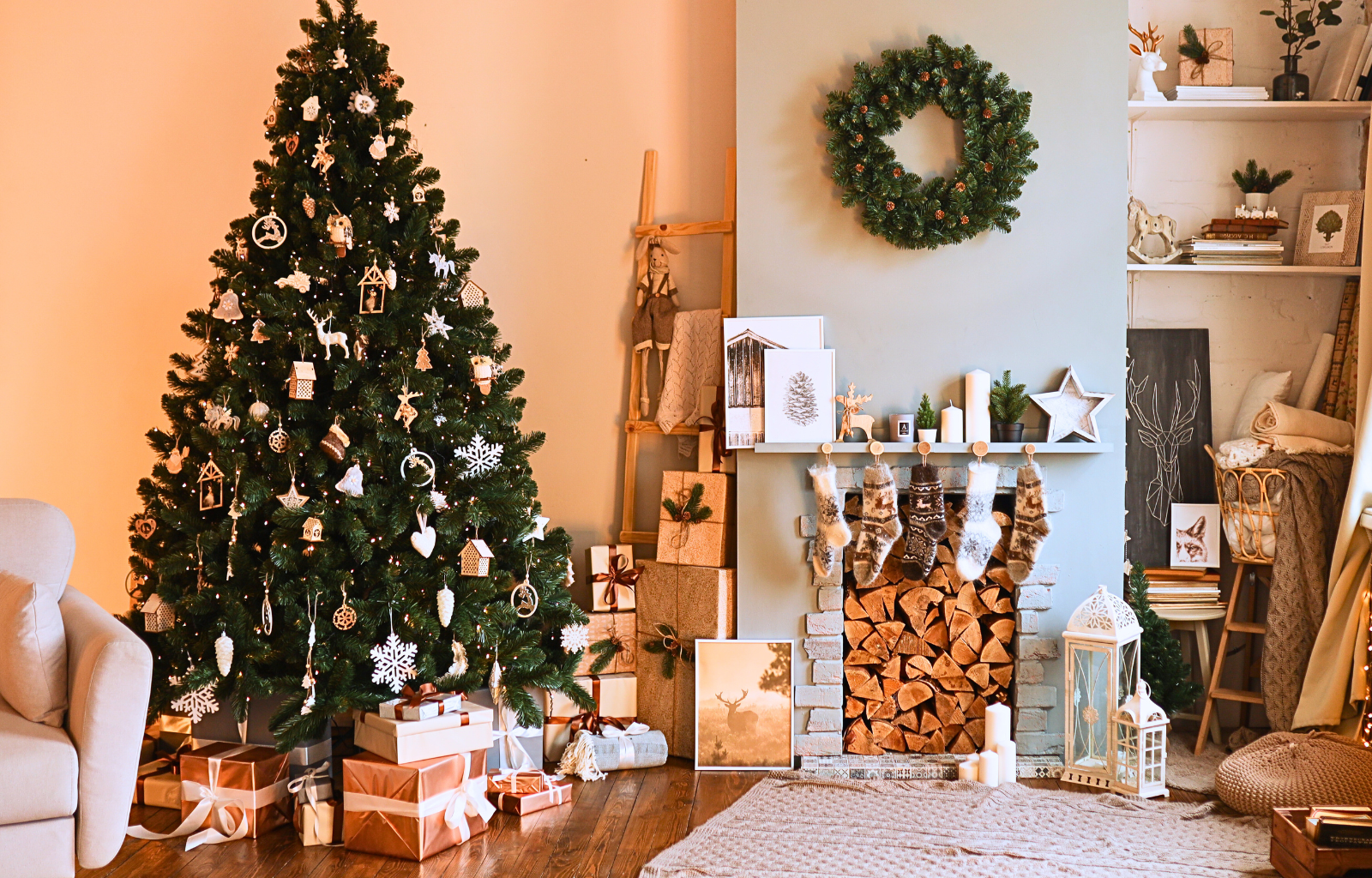 The benefit of using a color scheme to guide your holiday decor is that it creates a cohesive look throughout your home. We all know that green and red are the classic colors of the holidays, likely due to the red berries and evergreens that stand out this time of year. Gold, white, and silver are other timeless holiday color options that combine well with red and green and lend a more contemporary look to your design. If you’re looking to experiment a bit more with your holiday decor this year, try incorporating sky-blue elements to evoke the feeling of frost and snow, or—if you’re feeling especially adventurous—go with a rustic palette of natural wood tones to give your space a cozy, cabin-in-the-woods feel.