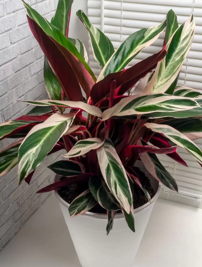 The Stromanthe sanguine is native to the rain forests of Brazil. This variety of the Stromanthe has leaves in different shades of white, red, pink and green. A Stromanthe can be grown indoors or outdoors, but will not survive a hard freeze. Since a Stromanthe is a relative of the Prayer Plant its leaves will fold up at night as though praying. Stromanthe produce reddish-pink flowers in the Spring, but are admired for their dazzling leaves.
